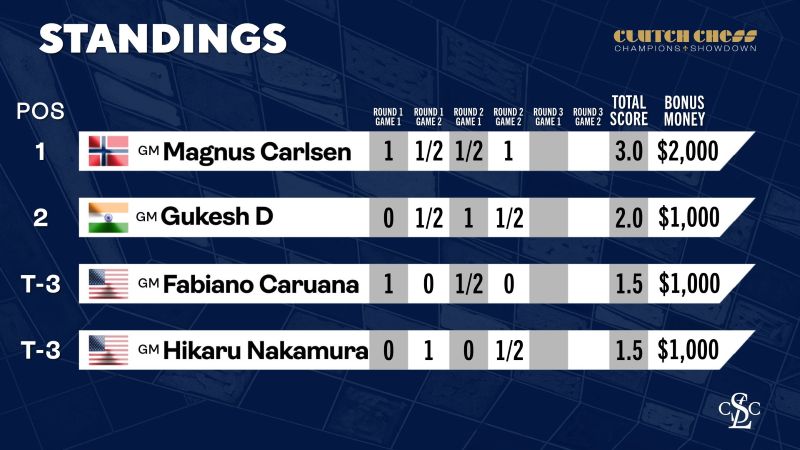 Гукеш одерживает блестящую победу над Фабиано Каруаной, завершив первый день Champions Showdown. Благодаря победе 2:0 над Фаби в третьем туре, Гукеш теперь единоличный лидер с 4 очками из 6!