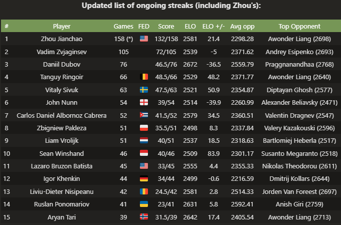 | Непобеждённая серия гроссмейстера Чжоу Цзянчао завершилась в прошлые выходные после 158 классических партий. Родившийся в Китае гроссмейстер вошёл в историю, установив рекорд самой длинной известной серии подряд сыгранных классических партий без поражений. |