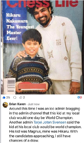 Другой администратор, Тарье Йотен Свенсен, сказал, что чемпион мира выйдет из его местного клуба. Его парень был Магнус, мой — Хикару.