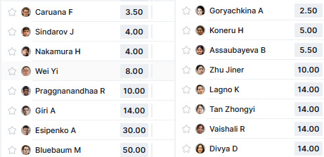 Где-то было высказывание Карлсена про низкие шансы Гири, а Гири то ли в полушутку, то ли в полусерьез ответил, что тогда ему стоит заняться чем-то другим ( но найти это мне очень сложно - пост же был картинкой, а не текстом). Гири, мне кажется, это может задеть. Кроме того, Гири сам раньше писал, что если Гукеш стал чемпионом, то и он теперь сможет. Все это может привести к мобилизации спортивных качеств Гири, как никогда ранее. Поэтому я бы поднял Гири в первую тройку к американцам. Ну а личные симпатии к Гири у меня выше, чем к американцам. Так что буду болеть за Гири. Потом за американцев (без особой разницы между ними, но не по политическим соображениям).