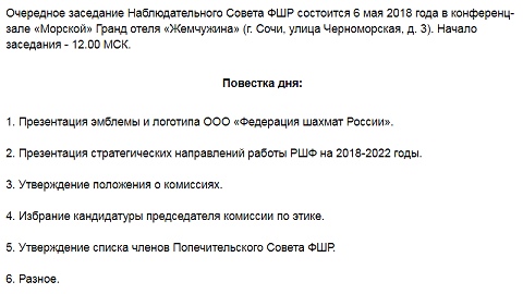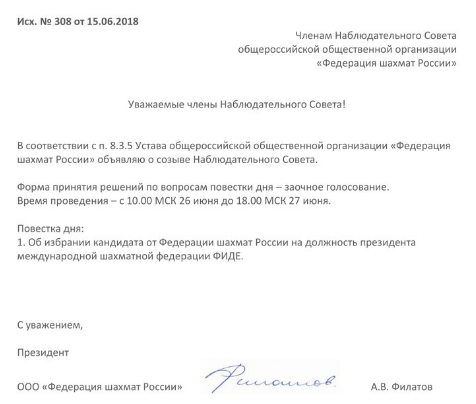 В понедельник 29 января в 24.00 завершилось заочное заседание Наблюдательного совета Российской шахматной федерации. В нем приняли участие 28 членов из 31. Наблюдательный совет сформировал список кандидатов для избрания на должность президента РШФ. В него вошли: Кирсан Илюмжинов, Заурбек Мальсагов, Сергей Нестеров, Иван Стариков, Эдуард Субоч и Андрей Филатов. Большинством голосов кандидатура Андрея Селиванова была отклонена.