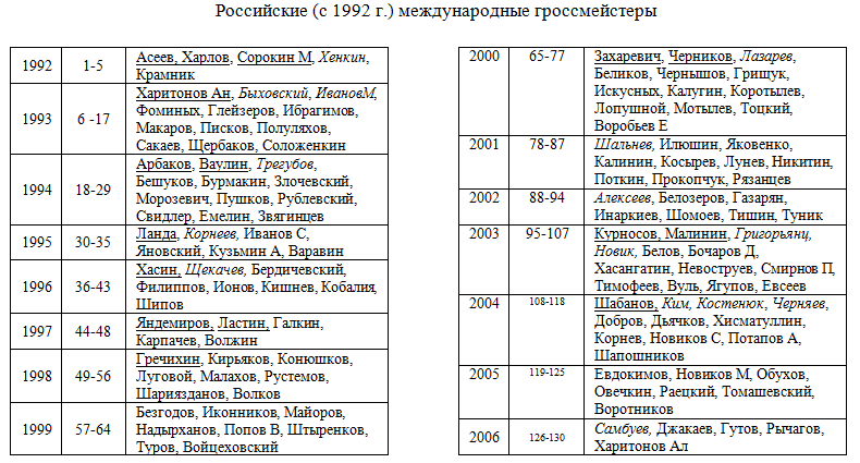 (Опирался почти целиком на данные из общего гроссмейстерского списка в Wiki, с россиянами у них ошибок значительно меньше, чем в "советской ретроспективе") |