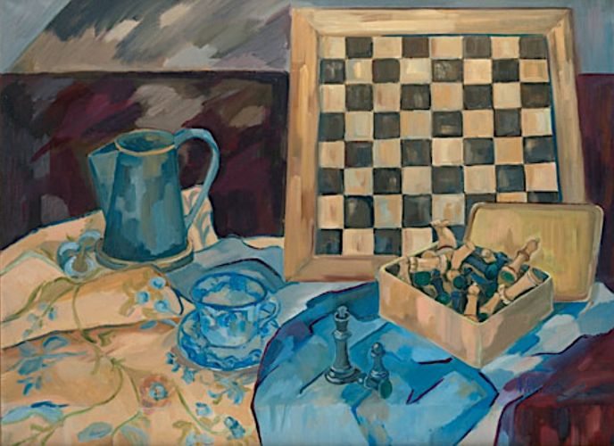 | «Учимся играть в шахматы» (около 1993 года) — поздняя работа русского художника Вячеслава Павловича Рассохина (1937–1998). Хотя он не был сильным шахматистом, ему удалось собрать обширную коллекцию шахматных наборов советского и царского периодов. |