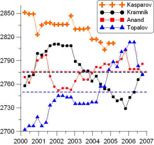 1. Лидер апрельского рейтинг-листа 2008 Ананд «сделал» бы лидера январского рейтинг-листа 1976 Карпова в матче из 20 партий со счетом 13-7 (т.е. почти с двукратным преимуществом по очкам)