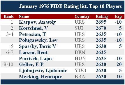 3. Чемпион Мира Карпов-76 делил бы сейчас 25-29 место с Мовсесяном, Домингесом, Чепариновым и Рублевским. И был бы позади, например, Грищука, Алексеева, Яковенко, Полгар, Бу, Бакро и Ни.