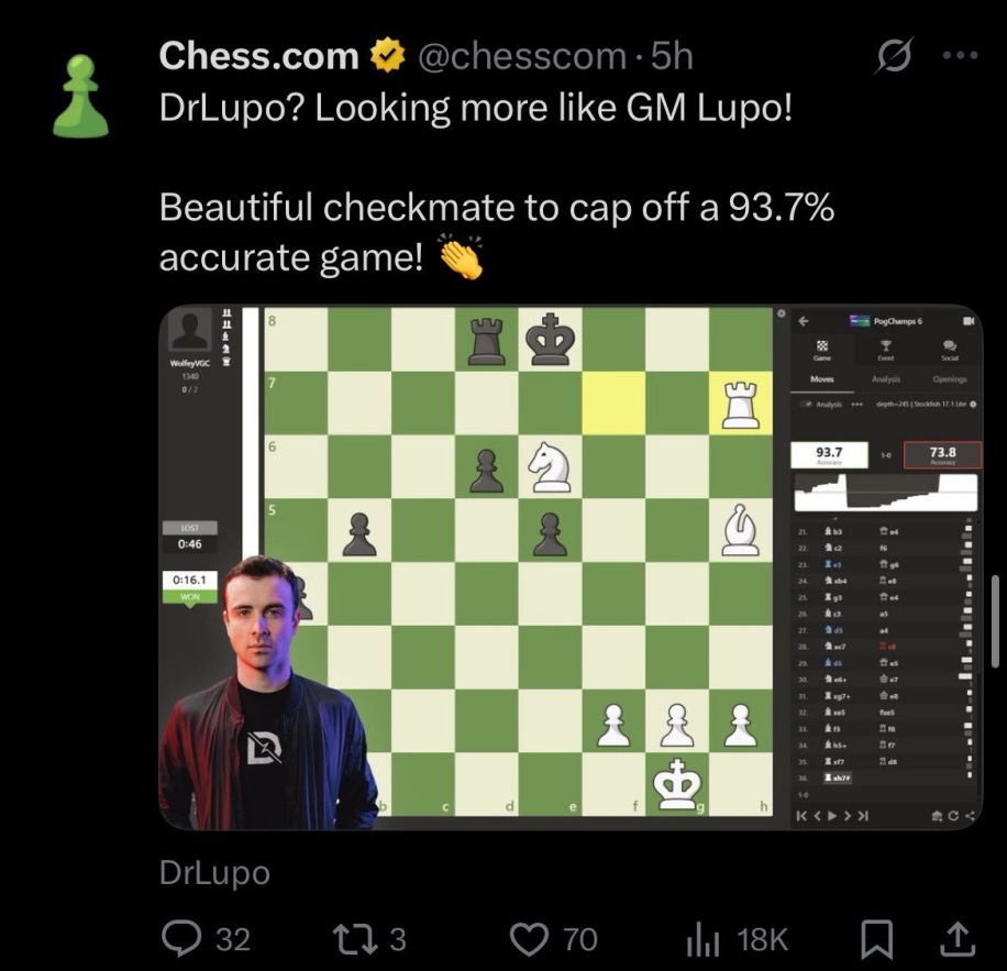 Правда потом твит стыдливо удалил, но на момент написания их не смутило, что 600 рейтинга против 1200 с аккураси 94% выигрывает, совсем не смутило. Это уже красный флаг даже без того, чтобы в текст партии смотреть, ну а если в пол-глаза посмотреть, то он не красный флаг, а чёрная метка.