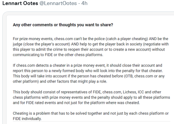 По поводу исключения Нимана из турнира заявил Длуги в недавнем интервью Левитову. Якобы Карлсен потребовал задержку времени и повышенные меры контроля, те все выполнили, а потом Карлсен докинул «а ещё Ханса исключить».