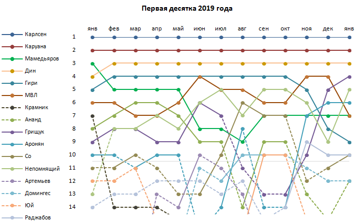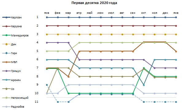 16 (!) человек отметилось за год в Топ-10 ("норма" последних лет 13-14 человек), только шестеро присутствовали с января до января.