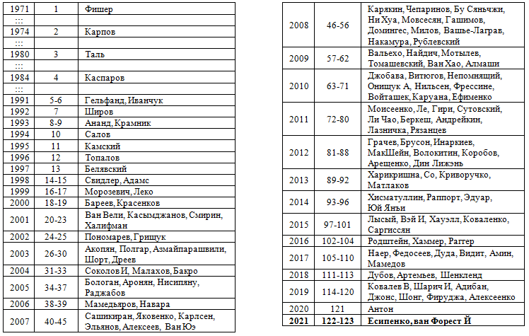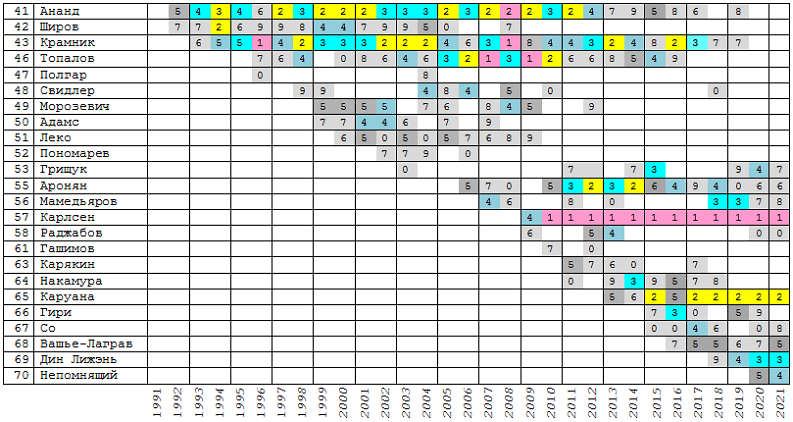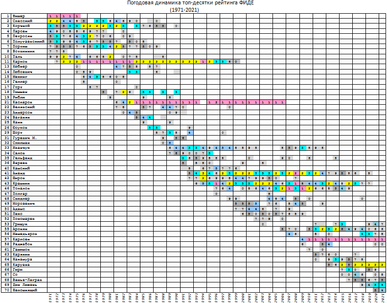 Погодовая динамика топ-десятки рейтинга ФИДЕ, 1971-2021 (фрагмент)