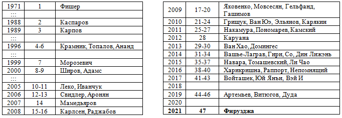 13 (1978) Горт 3 2 30 (1994) Крамник 27 27