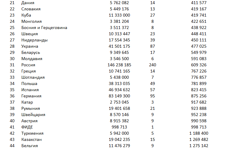 | onedrey: Не ожидал, что Германия на втором месте по числу гроссмейстеров. Понятно, что много эмигрантов, но всё равно вряд ли бы назвал её, если бы мне предложили угадать ТОП-5 стран |