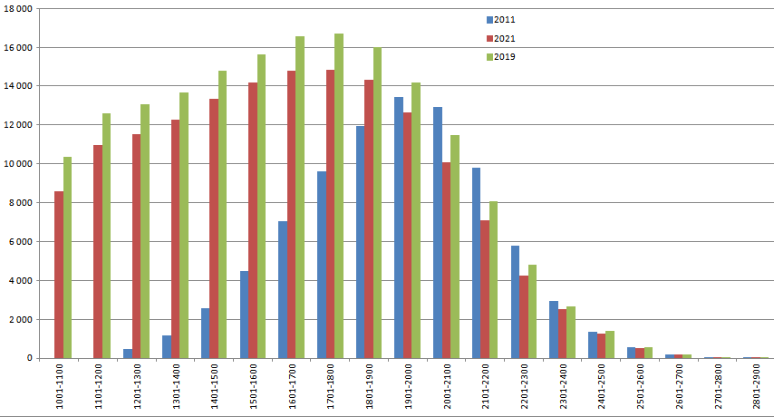 Сравнивать лучше всего по третьему графику. В 2021 многие стали неактивными, поэтому все группы падают. В 2019 году видно, что падают вплоть до 2300-ников, а выше уже чуть посложнее картина.