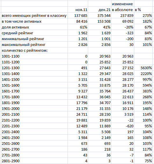 Про выводы, какие можно сделать из этих цифр, я ничего не знаю. Но общий прирост колоссален, а если бы не пандемия, был бы ещё больше. (Я как-то вроде бы приводил цифру: ежегодный улов (попадающих в сети рейтинга ФИДЕ впервые) давно перевалил за 30 тысяч).
