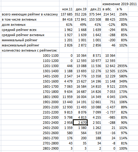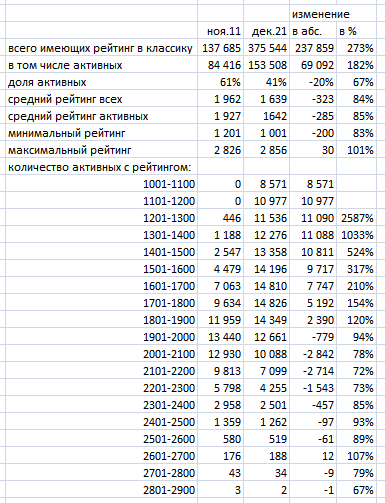 О, а по активным игрокам уменьшение в абсолютных числах идёт вообще на отрезке 1900-2600! Ну и что это, если не дефляция, вызванная тем, что рейтинги внизу рейтинг-листа существенно занижены? |