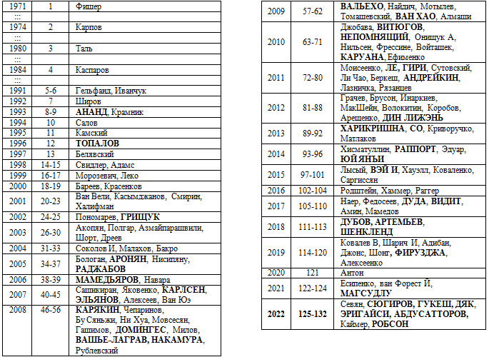 Рекордная цифра числа новых присвоений - 92 в 2007, прирост же за тот год составил 64 (источник - www.chessratings.top). То есть, в 2007 покинуло белый свет 28 гроссмейстеров (!?) |