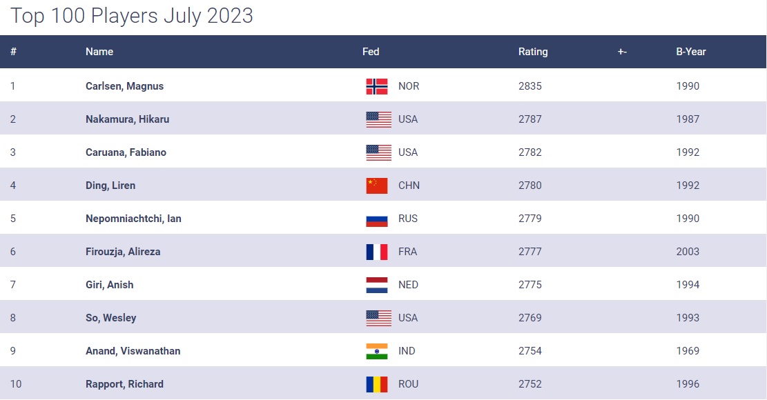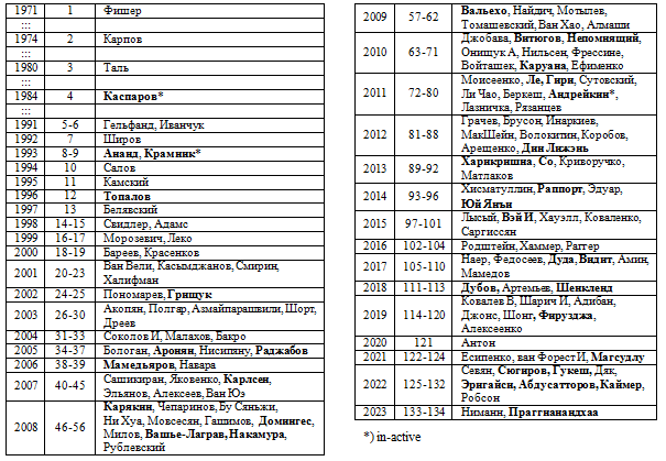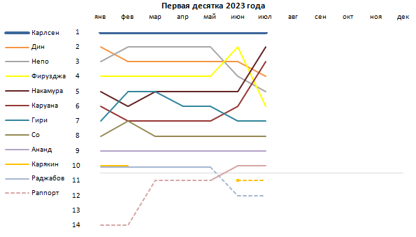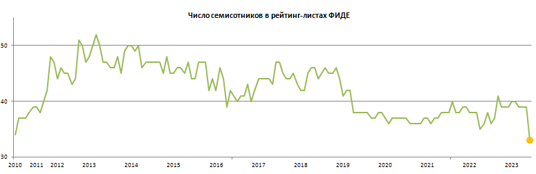 Но такого, чтобы за раз (за один рейтинг-лист) число семисотников снижалось сразу на 6 человек, по-моему, не случалось вообще никогда. То есть, бывало, что разом опускалось ниже 2700 и поболее, но одновременно сколько-то и поднималось. В июне 2023 ни одного "поднявшегося" не оказалось.