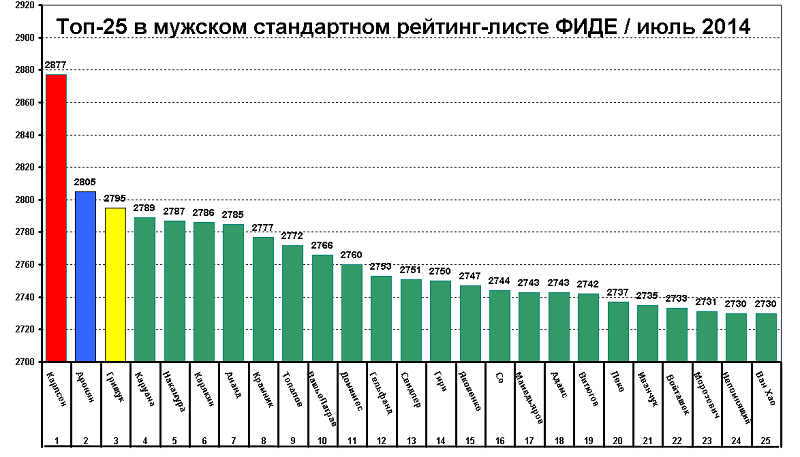 Кстати между прочим. Ежегодный прирост среднего Эло первой сотни в последне время существенно замедлился (это можно найти на сайте ФИДЕ). И в 2013-м (по отношению к предыдущему) впервые составил всего... один пункт.