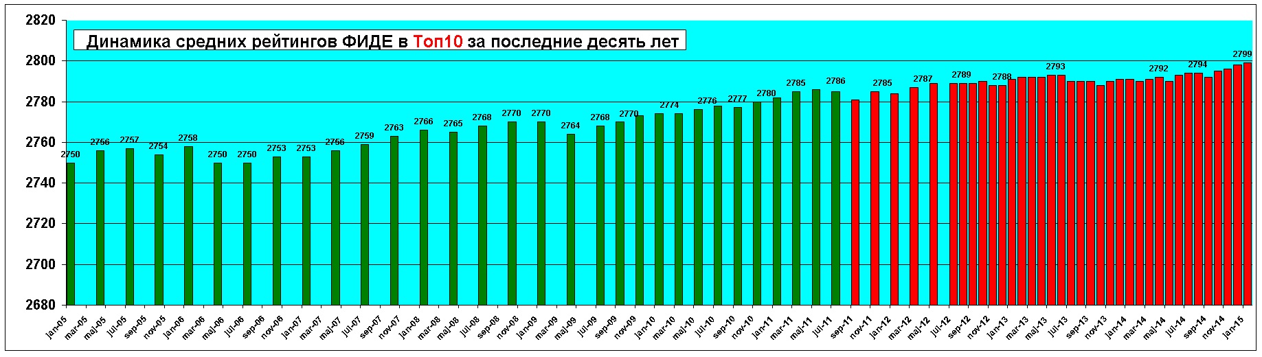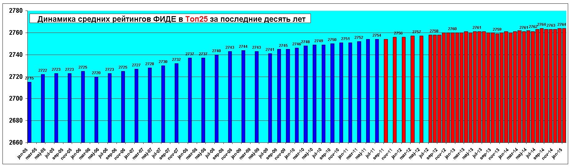 the average of the top 10 active players rose from 2751 in July 2000 to 2794 in July 2014, a 43-point increase in 14 years (из Википедии)