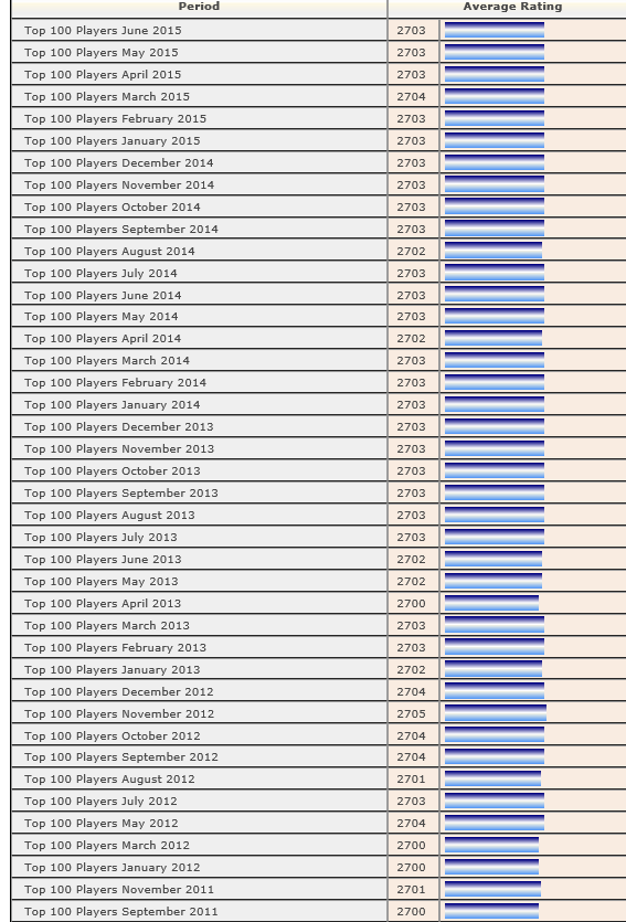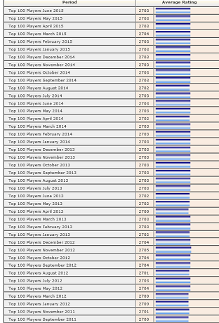 | Кстати, французская лига нанесла, как мы знаем, среднему рейтингу Топ50 серьёзный урон. В результате и средний рейтинг Топ100 в июле спустится до 2702. (А если будет дележ сотого места, то может быть и ещё ниже) |