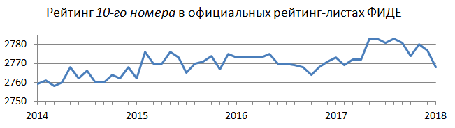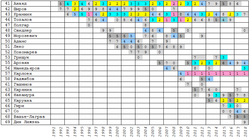 "Погодовая динамика топ-десятки рейтинга ФИДЕ, 1971-2018" (нижний правый фрагмент)