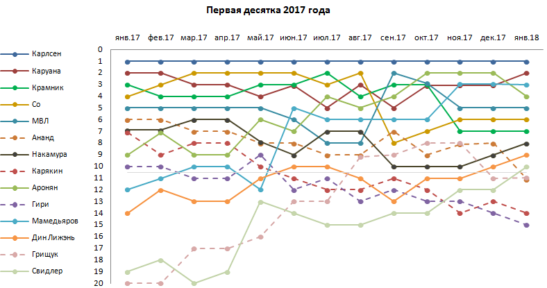 С учетом вскочившего на подножку Свидлера всего в течение года в Топ10 побывало 14 человек, а в составе итоговой десятки по сравнению с предыдущим годом целых три замены: места Ананда (6-ой в январе 2017), Карякина (7-8) и Гири (10) заняли Мамедьяров, Дин Лижэнь и Свидлер.