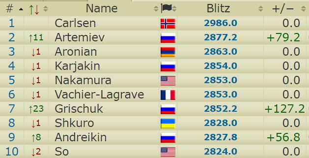 В блиц-рейтинге нет ничего привычно устойчивого. Единственный (!) островок стабильности - Карлсен, только он один.