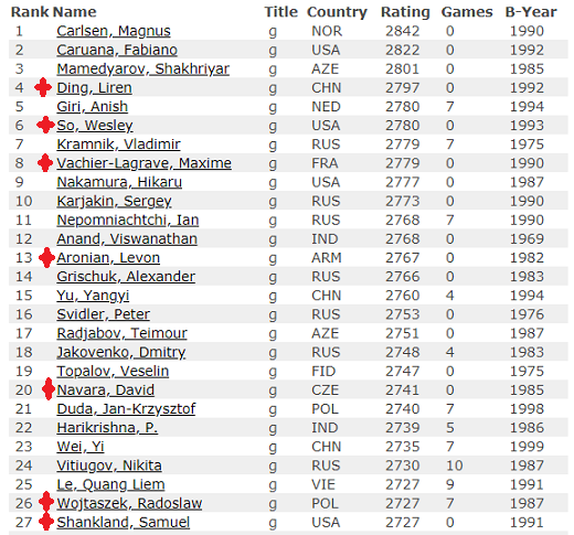 27 человек, у кого текущий рейтинг от 2727 и выше, в КМ-2019 проходят "гарантированно": отмеченные семеро, плюс будущий чемпион мира - "вне рейтинга", остальные 19 - по среднему рейтингу (18 мест основных и одно резервное)