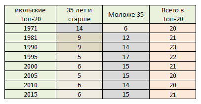 Нет, это понятно. Но в те далекие времена, надо думать, и "в массе", то есть в Топ-100, картина была похожей: преобладали те, кто был старше 35-ти лет. Только вот была ли динамика омоложения Топ-100 столь же стремительной, как Топ-20?