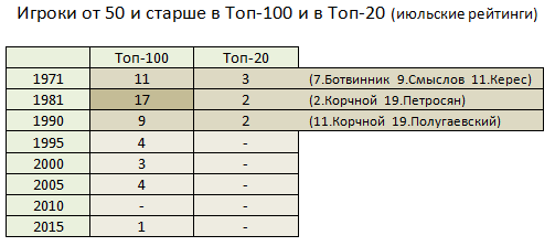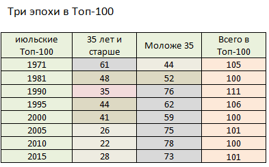 2. А что если в Топ-100 (да и в Топ-20) выделить настоящих ветеранов - тех, кому за 50? Не усилим ли мы тем самым эффект "смены эпох"?