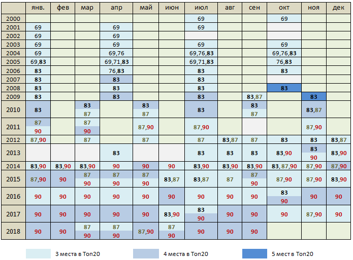 | Для этого хотелось бы посмотреть табличку топ 100 по годам хотя бы с 90-го года. Из последней таблички топ 20 никаких особых выводов я не вижу, ничего драматичного, чего бы не было видно из более ранних табличек, представленных Почитателем. |