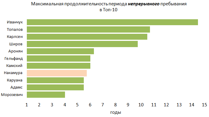 | Нет, вроде никого больше не упустил. У Салова тоже семь с половиной, но это когда было. Накамуре всего 8 лет исполнилось, когда тот вылетел из Топ-10, а через четыре года и вообще завязал. |
