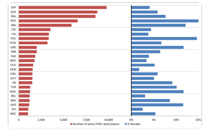 Countries with over 1000 active FIDE rated players. None with over 15% female.