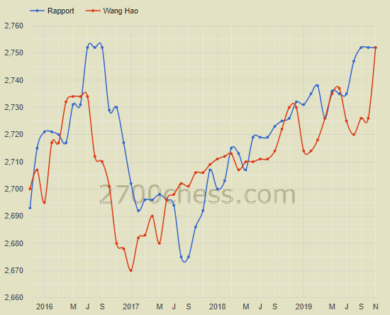 Ван Хао, как отмечалось, только что повторил свое высшее в карьере рейтинговое достижение (2752), впервые достигнутое ещё в 2013 году. На той же высшей для себя высоте ещё с сентября располагается и Р.Раппорт - и тоже во второй раз в карьере: впервые он сюда забирался в середине 2016-го.