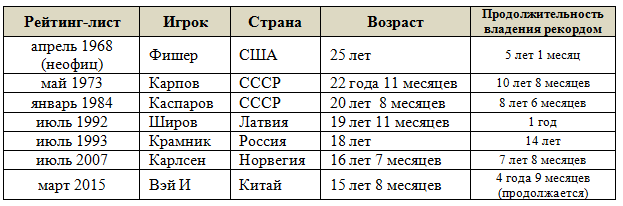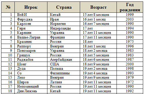 | Если кого интересуют имена, не попавшие "по возрасту" в последнюю таблицу - у меня имеется её продолжение. Сдуру решил составить "клуб Анатолия Карпова" - список всех, кто стал семисотником в возрасте до 23-х лет. Это отняло больше времени, чем того заслуживала "идея": в списке оказалось аж 49 человек. |