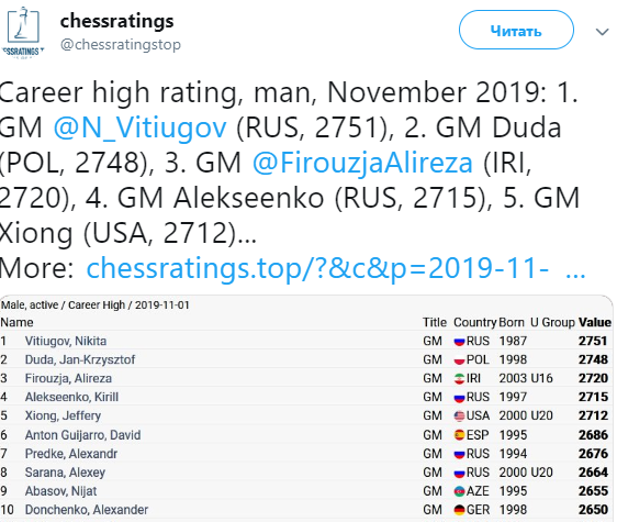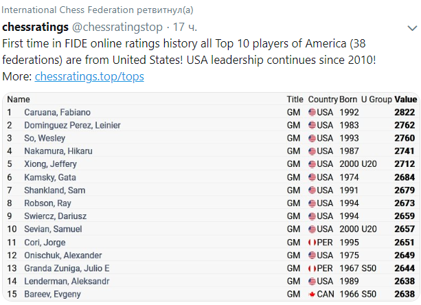 | Почитатель: только что открыл для себя удивительный сайт https://www.chessratings.top, содержащий все (не Тор-100) стандартные рейтинги ФИДЕ с 2001 года. |