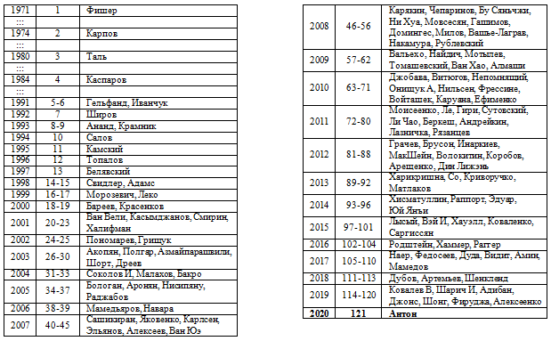 Неточность: с Алексеенко, вступившим "в клуб 2700" в возрасте 22 лет и 4 месяцев, "клуб Анатолия Карпова" насчитывает ровно 50 членов. |