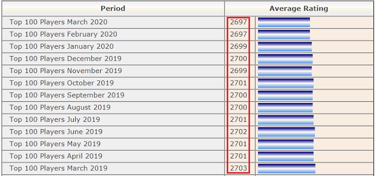 Дефляция в топ100 нарастает, средний рейтинг за год упал на 6 ЭЛО.