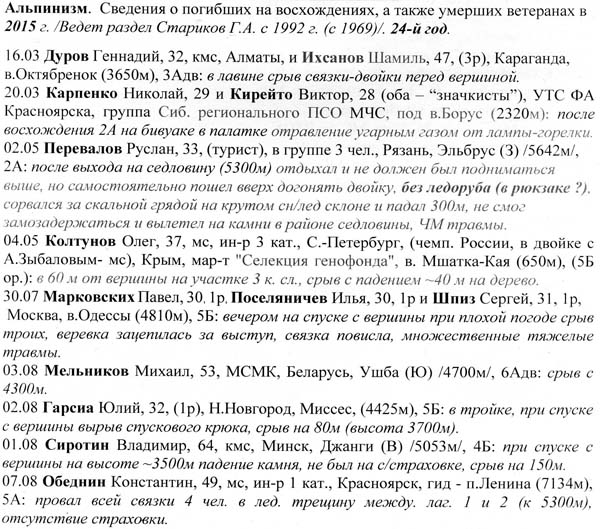 "урожай" у дамы с косой в этом году приличный. особенно нелепо (не считая угара мчс-эсовцев в палатке) выглядит смерть сразу 4-х опытных томичей на смешном маршруте в горном алтае. обчная дневная радиалка пусть и при неблагоприятной погоде обернулась трагедией. вовремя не отреагировали на смену погоды, не повернули раньше, в результате промокли и замерзли. у одного вроде проблемы со здоровьем начались, остальные, видимо, пытались тащить, до темна не успели, а помощь в такую погоду тоже организовать не получилось-мчс и друганы пошли за ними вечером, но вернулись(камнепад, ветер, дождь, ни зги не видно). ночь без палатки в такую погоду, мокрые насквозь-замерзли. никто не понимает как так... на детском маршруте. в любую погоду если двигаться (спускаться) погибнуть (от замерзания) практически невозможно. тем более всем 4-м. рация была. на помощь звали. странно все как-то.