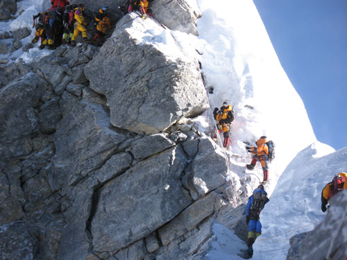 думаю, тут другое. невероятно сложно психологически второй раз оказаться у самой вершины и снова не зайти. тем более пахал на работе как проклятый. откладывая по доллару на мероприятие. знал, что больше шансов вряд ли будет будет. просто пошел ва-банк и не оценил последствия. а холл не смог снова жестко повернуть его, ибо сам настоял на повторной попытке друга при комплектовании группы, чувствуя вину за разочарование в 95-м. в результате сжалился и помог зайти, но ценой решающего перебора времени (они много потеряли на подъеме при прохождении 12-мтеровой ступени Хилари, которую опять-таки из-за плохой организации не провешали перилами шерпы и этим на ходу пришлось заниматься букрееву с билдманом, что привело к вынужденному простою, а затем и толкучке на самих перилах-народу собралось куча, как это часто там бывает (на фото ступень Хилари в наши дни):