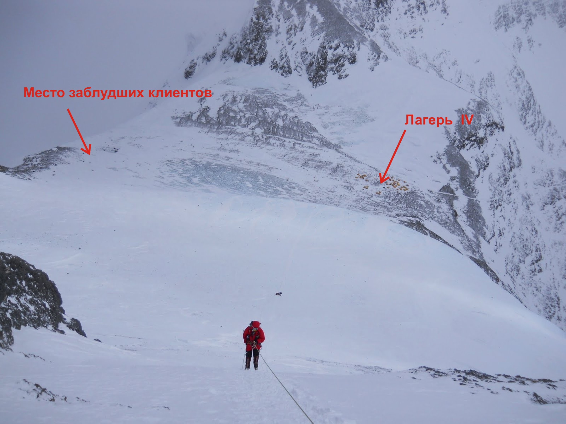 2. логическим продолжением такого подхода и стала ситуация на обратном пути, когда толя не стал утруждать себя возней с запаздывающей кодлой, а пулей (в 16 еще отставшие тюлюпались в районе вершины, а он в 17 уже был в палатке на 7900)слетел в лагерь один. пусть и для последующей потенциальной помощи. и даже при одобрении руководителя Фишера (которое по его словам он получил от него уже на спуске). это так, но... к примеру, спуститься не меньше хотел и второй гид-нил бидлман, но был вынужден возиться на горе.
