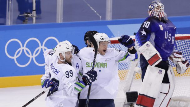Матч США - Словения начался раньше, но события в матче Россия - Словакия развивались быстрее. Уже к началу третьего периода словаки отыгрались, а в его начале - и вышли вперед. Словенцы же успели отыграть только один гол, что показалось нелепой случайностью. Однако отважные словенцы боролись до конца и, как положено, сняли вратаря, заменив его шестым полевым игроком почти за две минуты до конца матча. Эффект это принесло почти мгновенно: американцы недоглядели за Яном Муршаком, и тот с близкого расстояния сравнял счет!