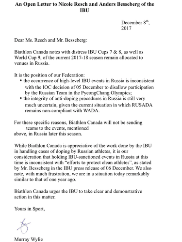 А бойкот в итоге объявляет не Россия, а Канада. Этапов Кубка мира по биатлону, которые запланировано провести в России