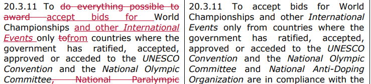 «Статья 20.3.11 гласит, что обязанностью международной федерации является «делать все возможное, чтобы заявки на проведение чемпионатов мира принимались только от тех стран, правительства которых ратифицировали, приняли, одобрили конвенцию ЮНЕСКО или присоединились к ней, а национальные олимпийские комитеты и национальные антидопинговые организации были признаны соответствующими кодексу».