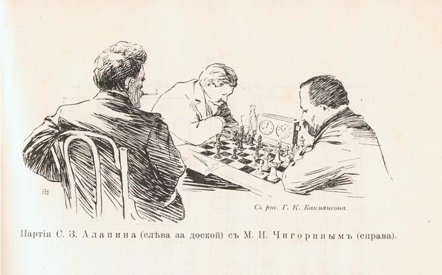 Алапинъ въ Россiи считался единственнымъ, кромѣ Шифферса, серьезнымъ соперникомъ Чигорина и, хотя онъ признавалъ первенство Чигорина и искренно уважалъ его тѣмъ не менѣe боролся съ нимъ настойчиво и иногда успѣшно. Слегка побаиваясь Алапина, Чигоринъ его недолюбливалъ и вѣчно спорилъ съ нимъ. Особенно онъ не выносилъ авторитетныхъ проповедей Алапина; алапинскiй апломбъ просто бѣсiлъ его.