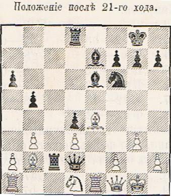 После 23...Kg8 вся борьба впереди, хотя позиция белых перспективнее. В цейтноте черные сыграли 23...Qd7? , но заметили 24.Rd1 , что выигрывает минимум пешку. Якобы Тарраш тут же, к вящему удивлению Алапина, вернул ход назад и пошел 23...Bd6?? , что оказалось еще хуже. После 24.f5 пришлось сдаться. После пришлось сдаться. Для современников была еще памятна история 1889 года, когда Тарраш, выступая на своей родине в Бреславле (ныне Вроцлав), получил важное очко на финише, применив следующий трюк. После 1.e4 e5 2.Nf3 Nf6 3.Nxe5 d6 4.Nf3 Nxe4 вместо 5.d4 он продвинул пешку лишь на одно поле. Алапин собирался развить королевского слона и уже дотронулся до него, как неожиданно заметил подвох. Конечно, он мог сказать: "поправляю" или "сначала, разумеется, Кf6"...Но Алапин просто сдал партию, так и не завершив пятый ход. Любопытно, что столь замечательную победу Тарраш включил в сборник "Триста партий". Остается добавить, что, несмотря на столь нелепое поражение, Алапин за счет побед над Бёрном, Гунсбергом и Луи Паульсеном все же взял в том турнире специальный приз за наилучший результат против призеров.