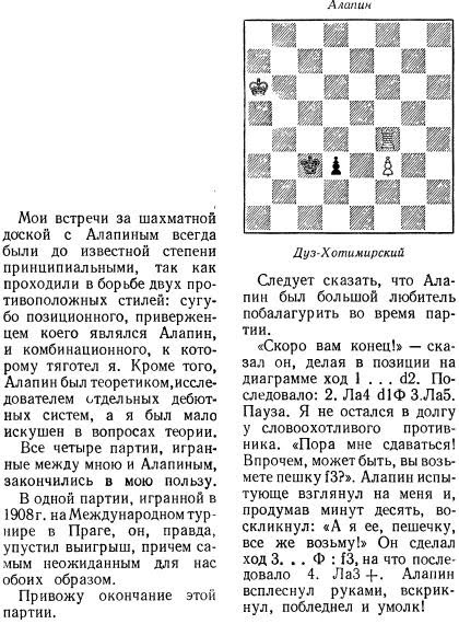 Год спустя Дуз-Хотимирский вновь победил Алапина, о чем сообщает в "Избранных партиях" (М. 1953, стр. 100).