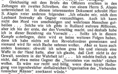 Конечно, навряд ли поручик Смирнский, ветеран русско-японской войны, читал местечковую газету, так что вызов на дуэль скорее всего попросту не дошел до адресата. Для нас интересна убеждённость Алапина, что на его стороне бог, "который не в насилии, а в правде". А также тот факт, что Алапин, по его признанию, не имеет ничего общего с революционерами (не удивительно для сына купца первой гильдии и племянника крупного банкира).