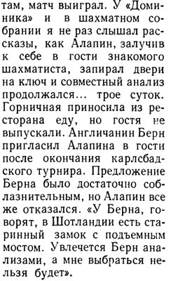 Алапина еле оттащили. Директора просили его не трогать игроковъ, "сидящихъ съ часами", и, чтобы отвязаться отъ русскаго дикаря, усадили его играть съ какимъ-то увядшимъ маэстро. Последнiй существовалъ именно тѣмъ, что обыгрывалъ разныхъ "пижоновъ" на маленькiя суммы. Онъ предупредилъ Алапина, что менѣе пяти гульденовъ партiя не играетъ. Стали играть — Алапинъ выигралъ. Маэстро испугался и приналегъ — Алапинъ опять выигралъ. Маэстро совсѣмъ растерялся... Наконецъ, когда Алапинъ выигралъ въ третiй разъ — его противникъ сталъ плевать отъ злости, изругалъ директоровъ, что они нарочно подвели его, и заявилъ,что платить не намѣренъ. Директора просили Алапина не требовать денегъ съ 6ѣдняка. Тому, конечно, было все равно, заплатитъ нѣмецъ или нѣтъ, и онъ окончательно успокоилъ его, угостивъ пивомъ.