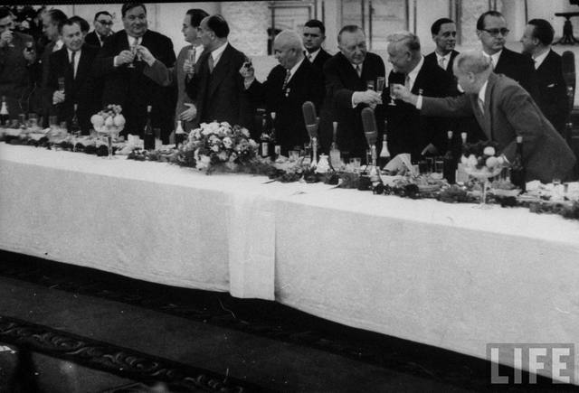 «За германо-советскую дружбу!» Аденауэр чокается с Молотовым, слева от канцлера – Хрущев, справа – Булганин