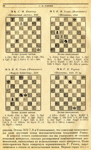 Выигрыш 1.Nc5+ Kc6 2.d7! Bxd7 3.Nd3 Bg5! (при отступах слона на другие поля черные отдают его за здорово живешь, без всяких надежд на дальнейшее сопротивление: Ba3 (d2,a3), Bh6 – 4.Ne5+ Kd6 5.Nc4+, Nf7+) 4.Ne5+ Kd6 5.Nf7+ Ke6 6.Nxg5+ Kf6 7.Nh7+ Kxg6 8.Nf8+ , приканчивая и другого слона. Одним Ринком в качестве объекта критики Каминер не ограничился. Советским композиторам, как он пишет, вдобавок «пришлось дать резкий отпор и механистическим работам ряда иностранных композиторов с Ф.Прокопом во главе». Ну, а как было обойтись без выпадов в адрес представителей капиталистического Запада? Времена не выбирают. Хвалить, что ли, иностранное в 1937-м?!